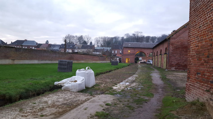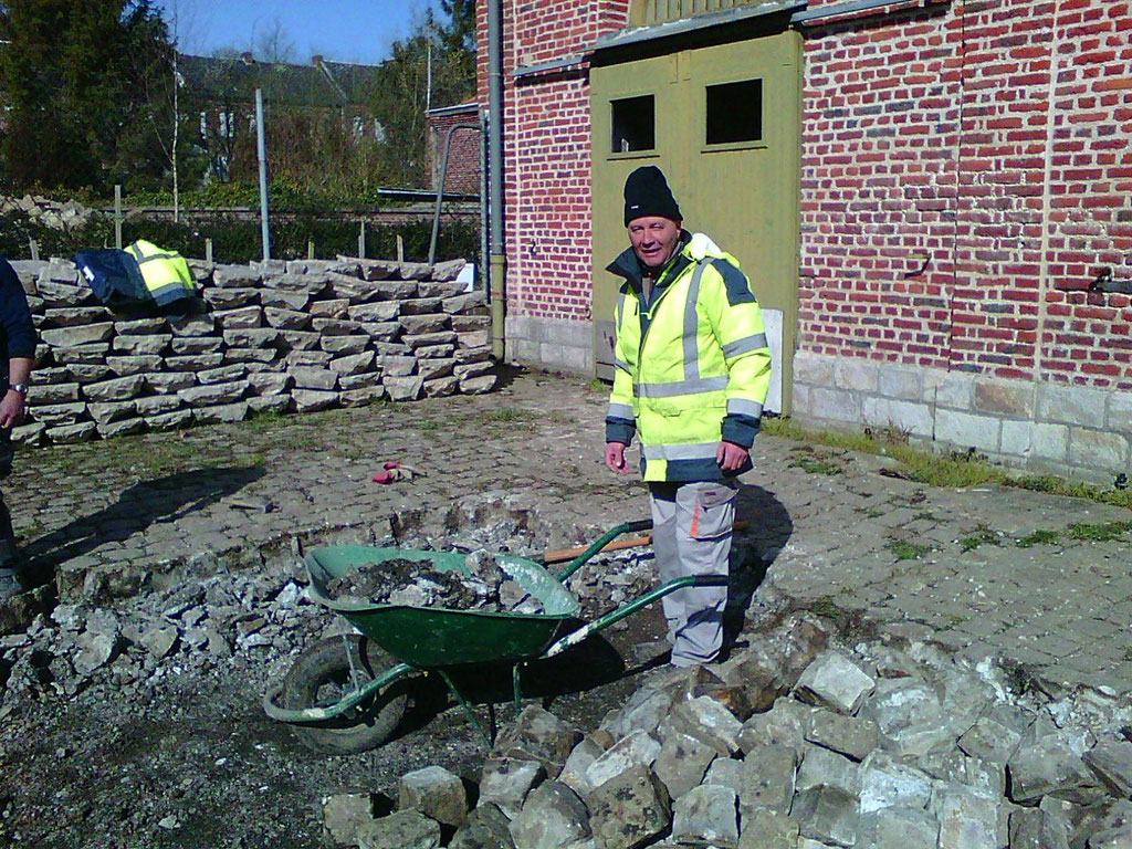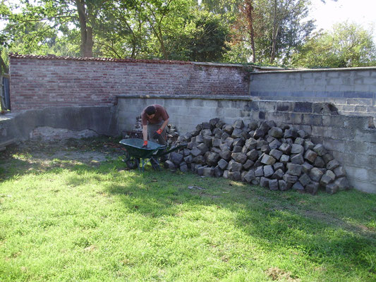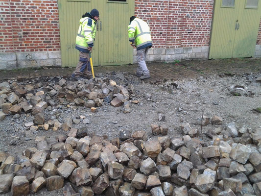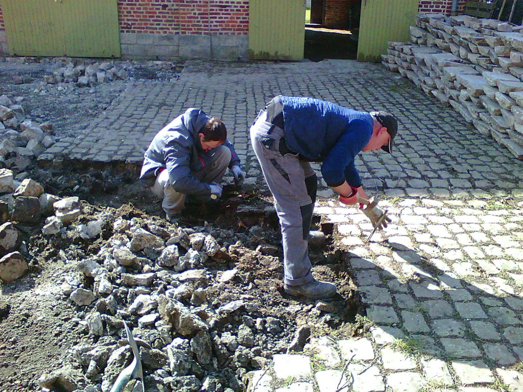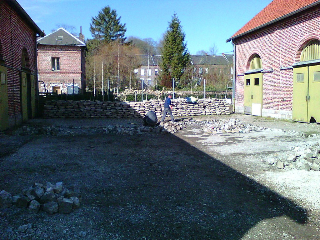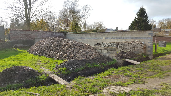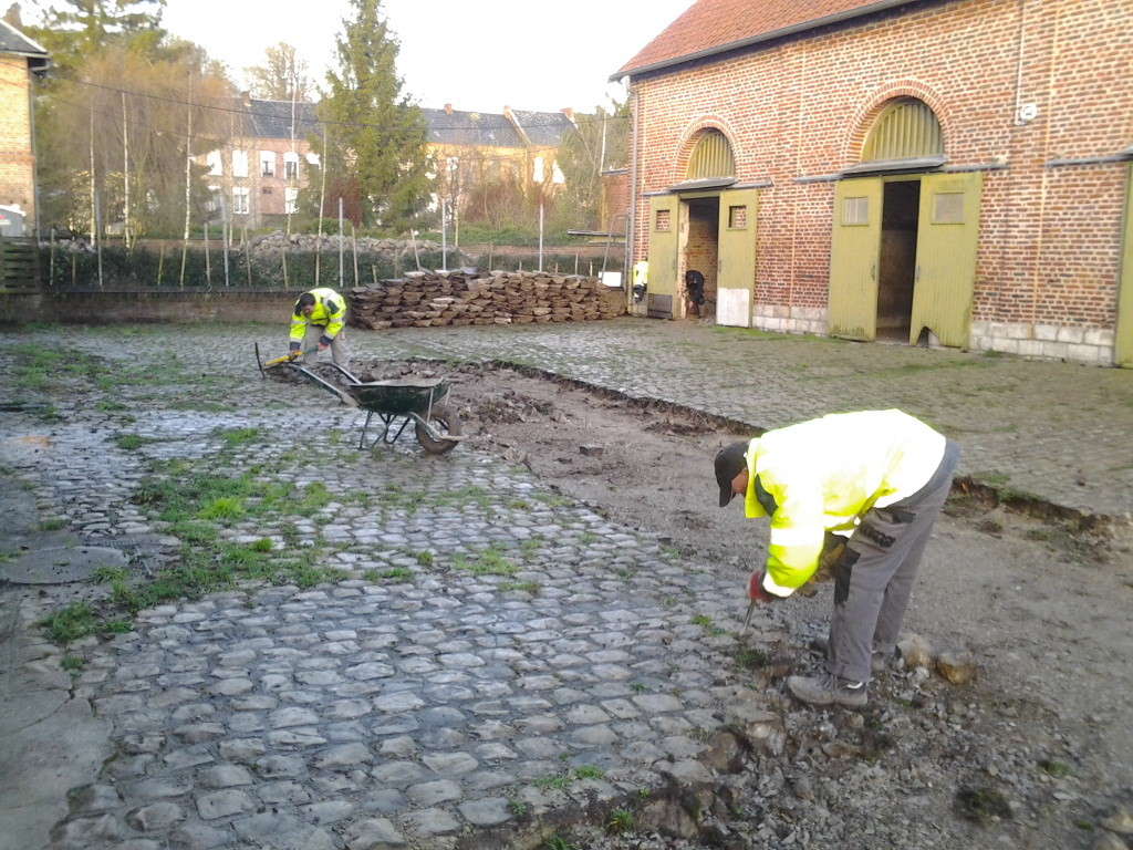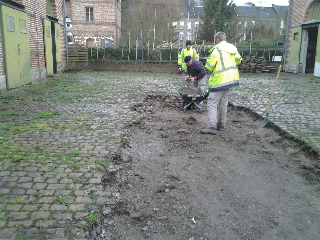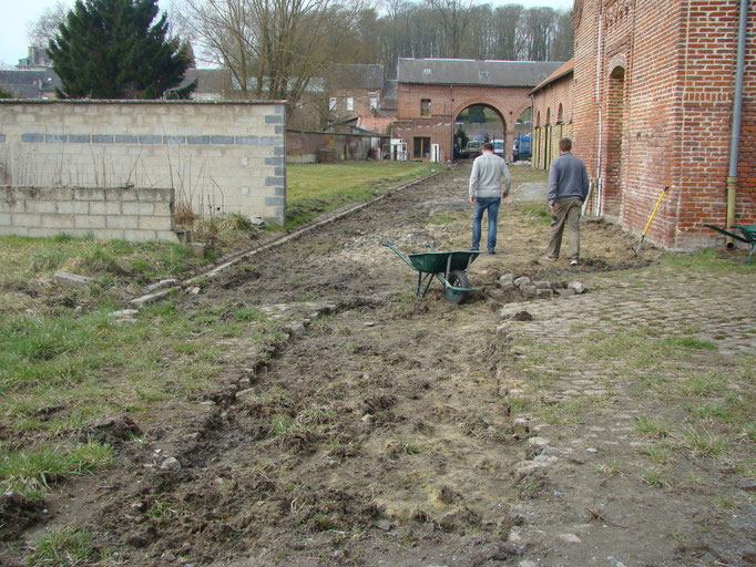 bouchée et de la remplacer afin de faciliter l'écoulement des eaux de pluie et assainir les bases du futur mur en projet de construction. Parallèlement le dépavage et l'entretien du site se
