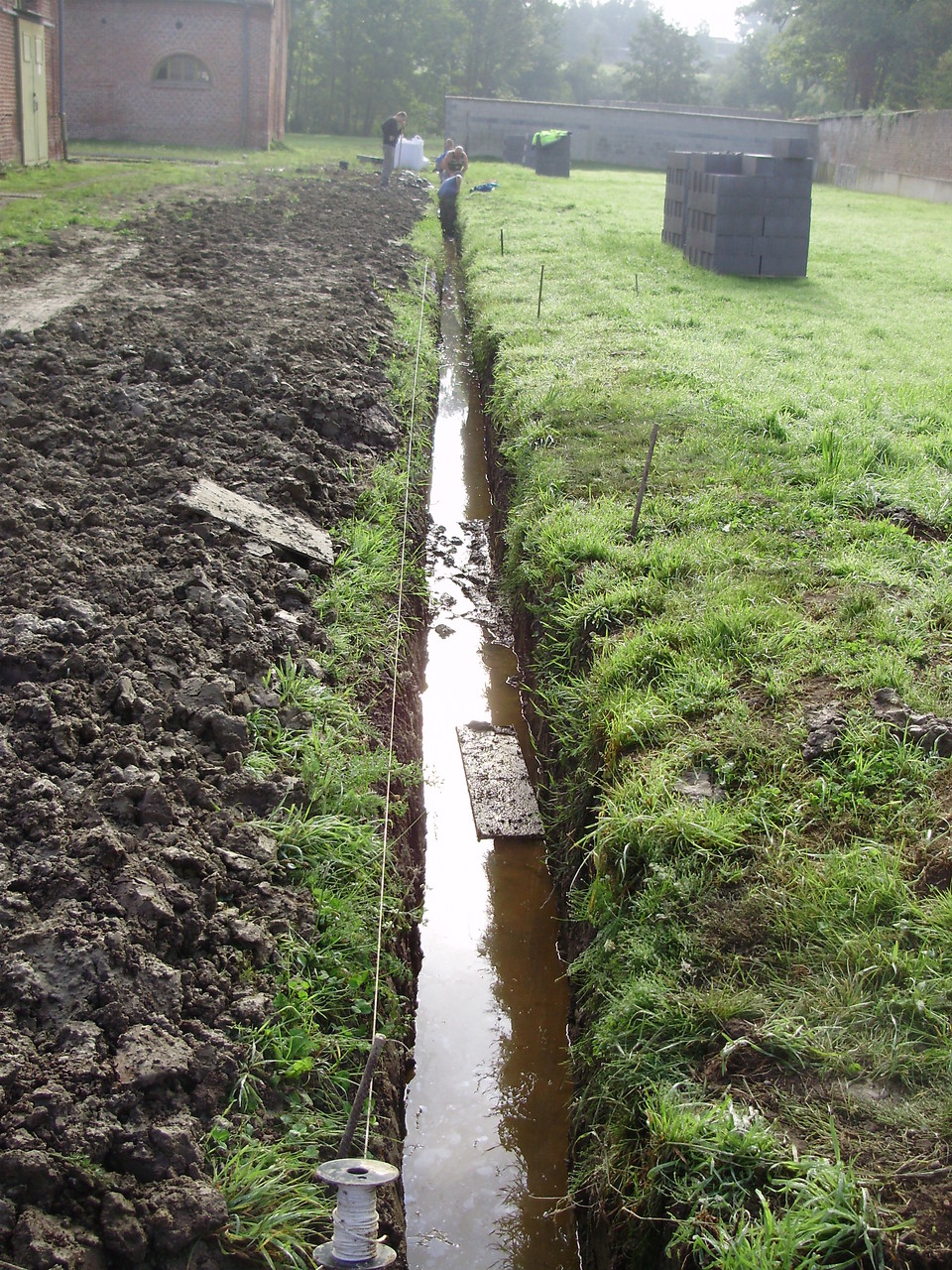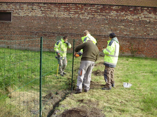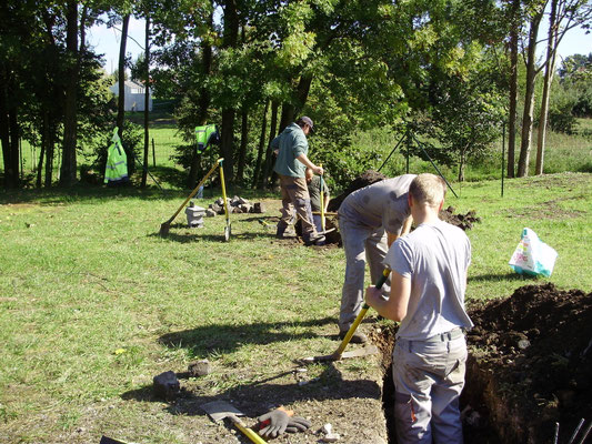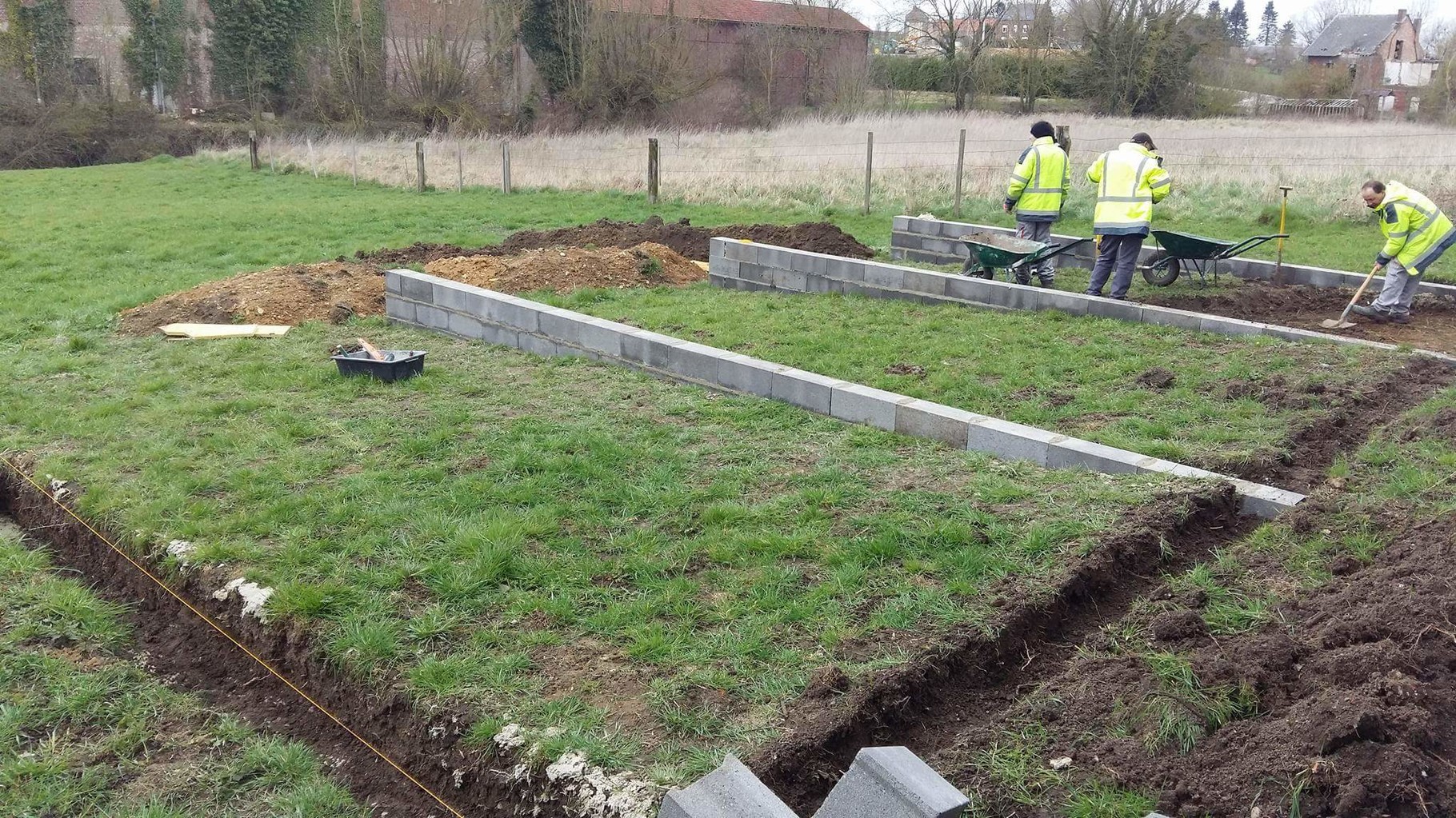 Les salariés sont en train de creuser les fondations d'un futur muret en parpaings qui va